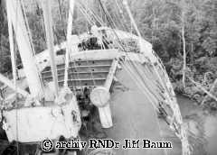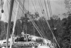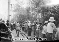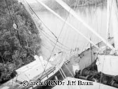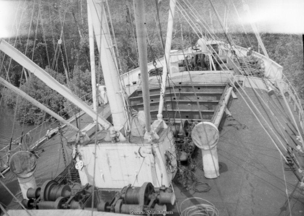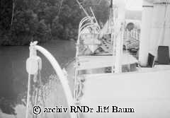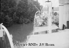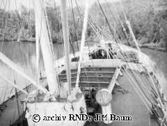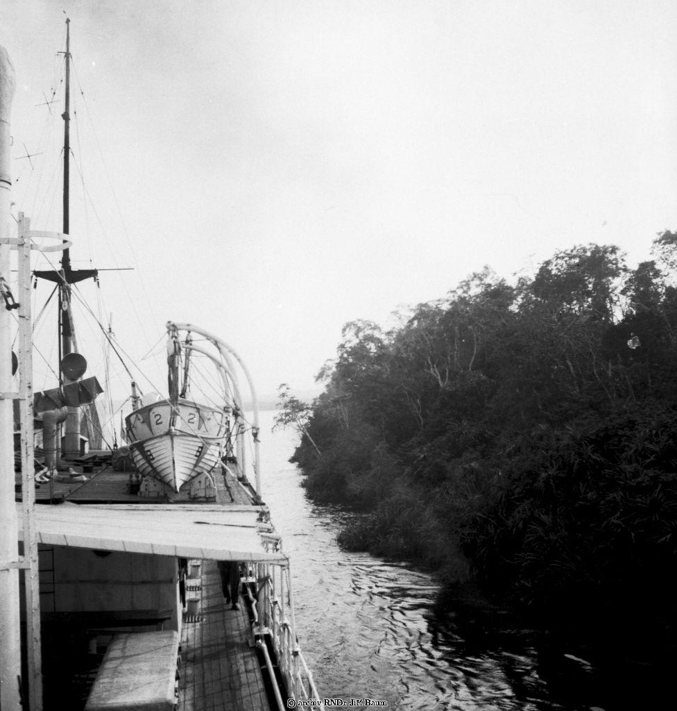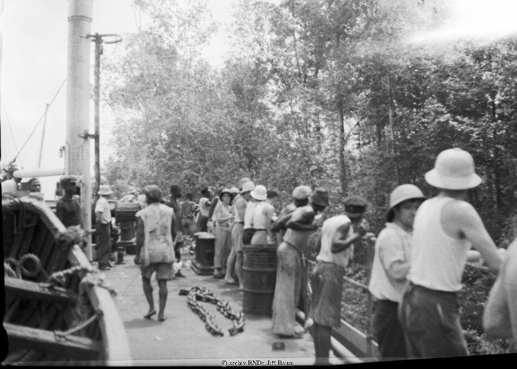 Mužstvo pozoruje manévr parníku těsně u břehu Nana Creek, Niger, 22.I.1939 - Nigeria - 1939 - F2