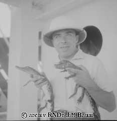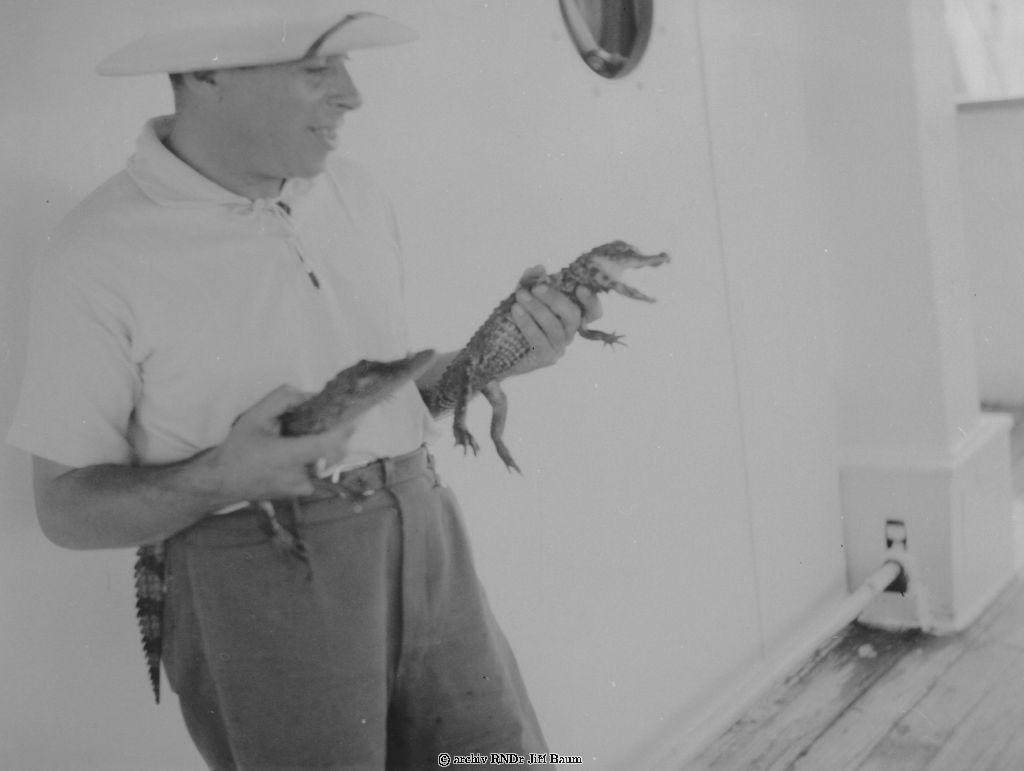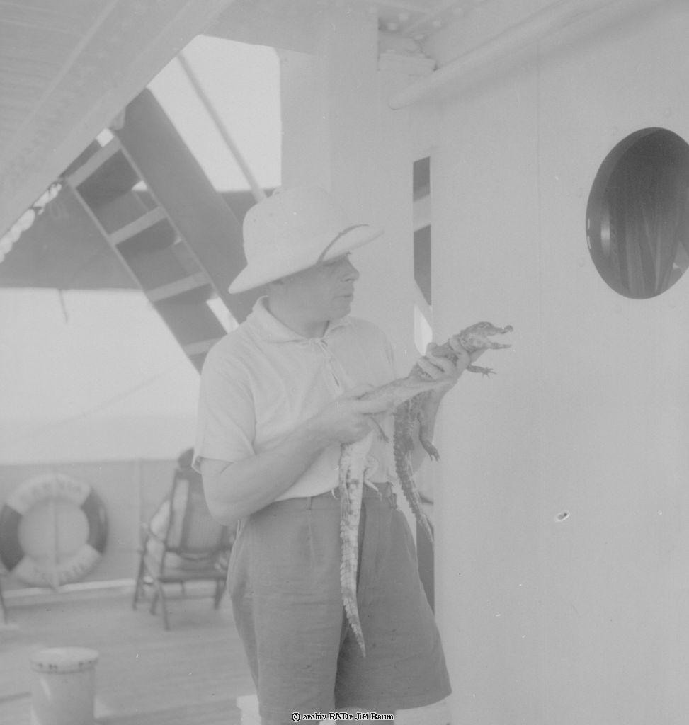OSTEOLEMUS TETRASPIS/otevř.tlama/ a CROCODILUS POROSUS a Dr.Jiří Baum na lodi u Sapele, Nigeria - Rodinné - 27.I.1939. - F1.